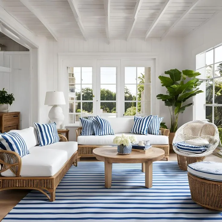 💡 Astuce déco: utilisez les teintes non seulement sur les murs, mais aussi sur les textiles (rideaux, coussins décoratifs, plaids), la vaisselle, les tapis, et même les luminaires. Un chemin de table rayé bleu et blanc suffit à évoquer une journée en bord de mer.